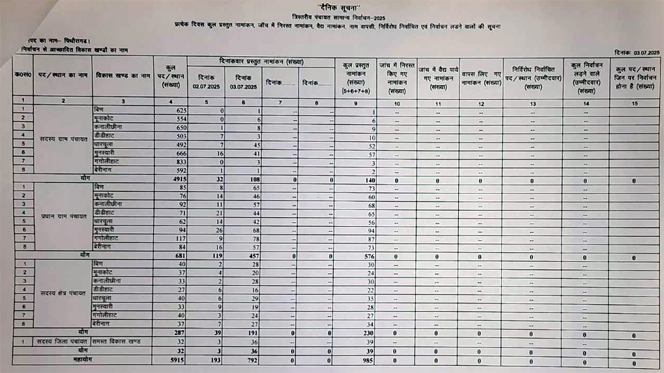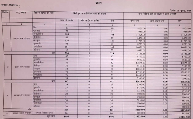 सीमांत जनपद में त्रिस्तरीय पंचायत चुनाव को लेकर नामांकन पत्रों की बिक्री व नामांकन प्रक्रिया जारी रही। बीते दिवस जिलेभर में कुल 1496 नामांकन पत्रों की बिक्री हुई, जिसमें ग्राम पंचायत सदस्य पद के लिए सबसे अधिक 724 नामांकन पत्र बिके तो वहीं नामांकन के दूसरे दिन 792 दावेदारों ने नामांकन कराया।