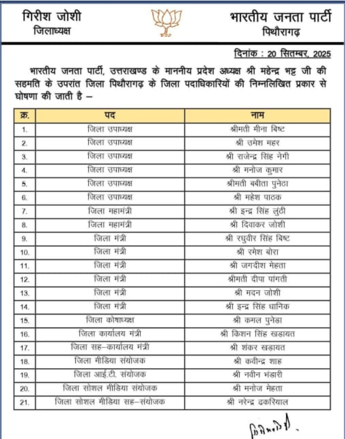 पिथौरागढ़ जनपद में भाजपा द्वारा नए जिला पदाधिकारियों की घोषणा कर दी गई की है। पार्टी के प्रदेश अध्यक्ष महेंद्र भट्ट और जिलाध्यक्ष गिरीश जोशी के अनुमोदन के बाद 21 नए पदाधिकारियों को विभिन्न पदों की जिम्मेदारी सौंपी गई है। इस संबंध में पार्टी कार्यालय की ओर से आदेश भी जारी कर दिया गया है…….