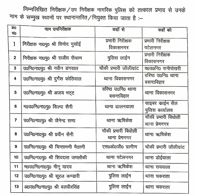 तबादले : 02 निरीक्षक, 10 उप निरीक्षक और एक अपर उप निरीक्षक का स्थानानंतरण